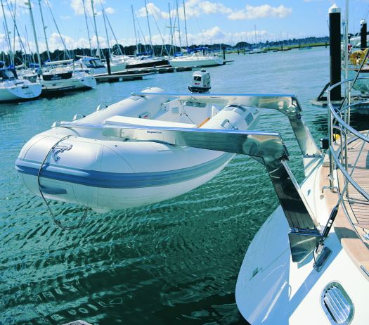 Zur exakten Positionierung des angehobenen Beibootes haben sie auf Gleitlagern ausfahrbare Arme.