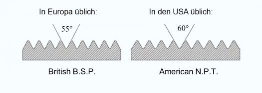 BSP Gewinde haben eine steilere und längere Flanke als metrische und auch als NPT Gewinde. Der BSP Flankenwinkel ist 55°, gegenüber 60° bei metrischen und NPT Gewinden (siehe auch die folgende Abbildung).