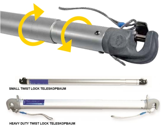 Die Twist Lock Bäume faszinieren durch den einfachen Verriegelungsbeschlag, der durch simples Verdrehen der Rohre gegeneinander ver- oder entriegelt. Das größte lieferbare Modell verfügt über 3 Teleskop-Elemente, deshalb die große Maximal-Länge.
