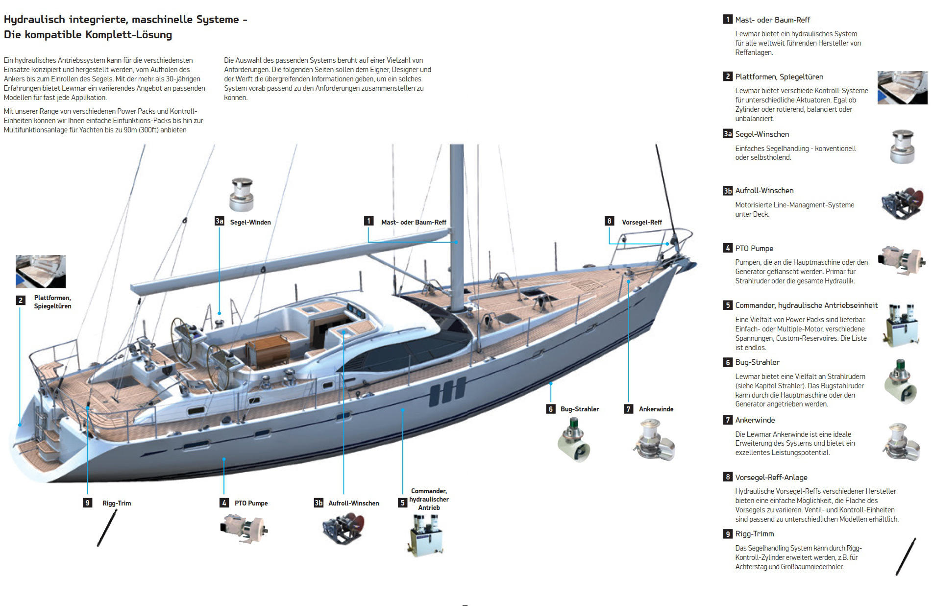 Seit 1983 hat Lewmar den Weg bereitet für hydraulisch betriebene Segelsysteme auf modernen Yachten aller Typen. Dies ermöglicht es mit kleiner Crew sicherer als je zuvor auch größere Yachten zu segeln. Eine Menge harter Jobs kann nun per Knopfdruck erledigt werden. Das macht das Leben einfacher und angenehm.