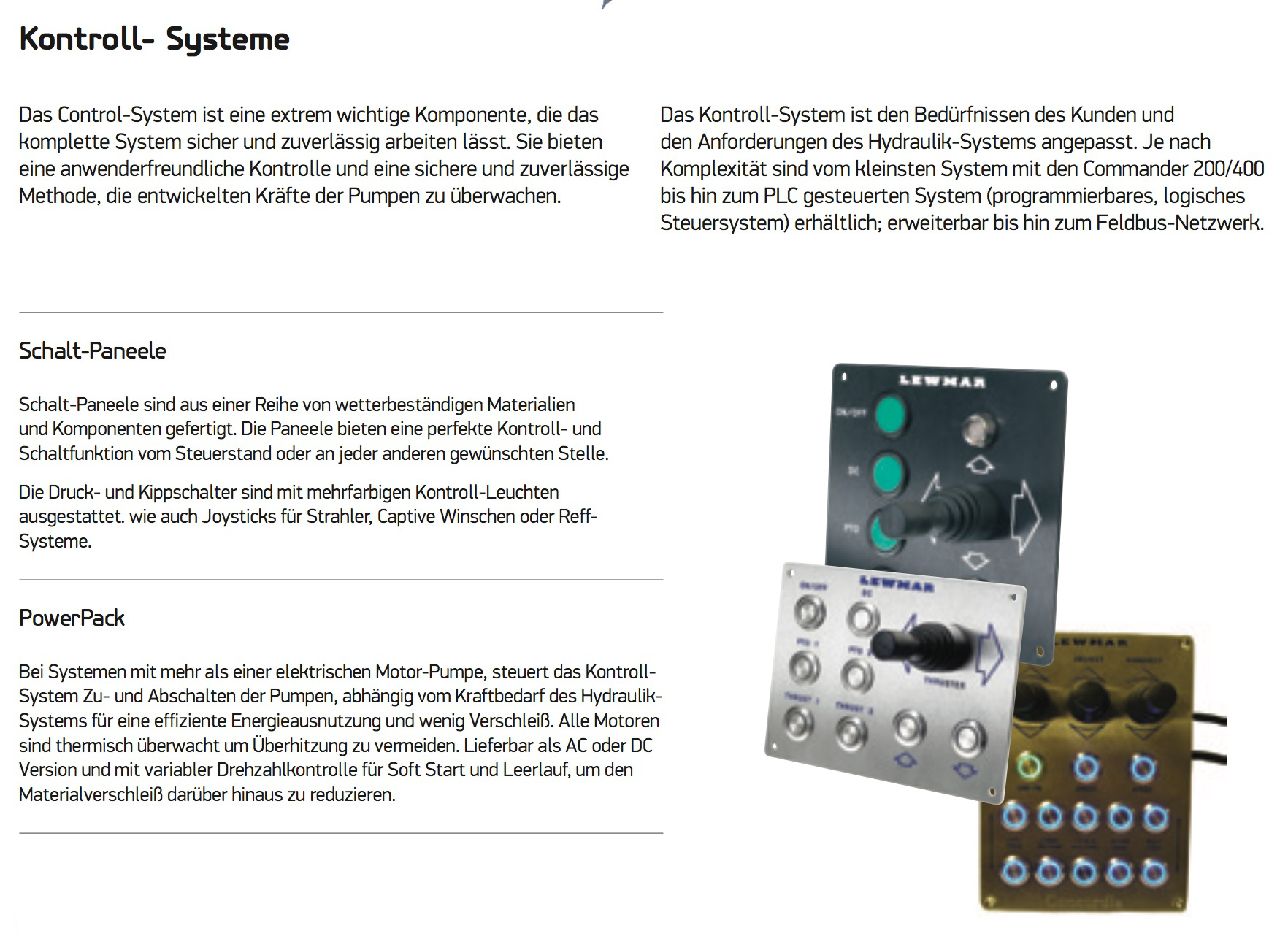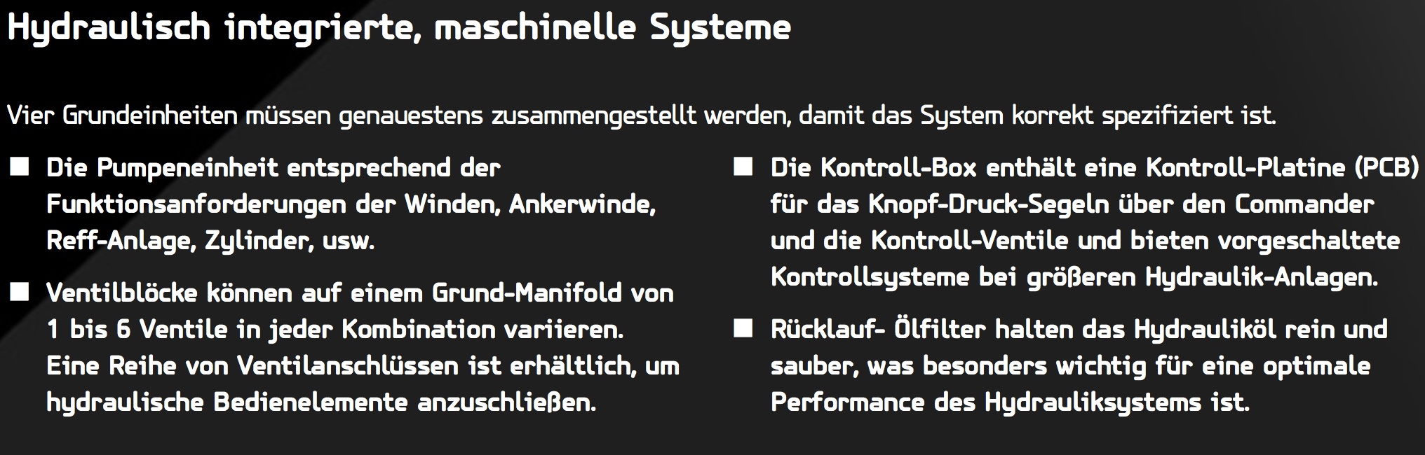 Mit unserer Range von verschiedenen Power Packs und Kontroll- Einheiten können wir Ihnen einfache Einfunktions-Packs bis hin zur Multifunktionsanlage für Yachten bis zu 90m (300ft) anbieten.