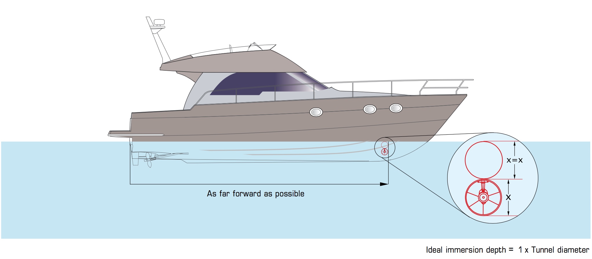 Der Propeller eines Tunnelstrahlers muss einen vollen Propellerdurchmesser unter der Wasserlinie positioniert sein, um einen optimalen Schub zu erreichen. Bugstrahlruder müssen generell so weit vorne im Bug oder so weit hinten im Heck positioniert sein wie möglich.