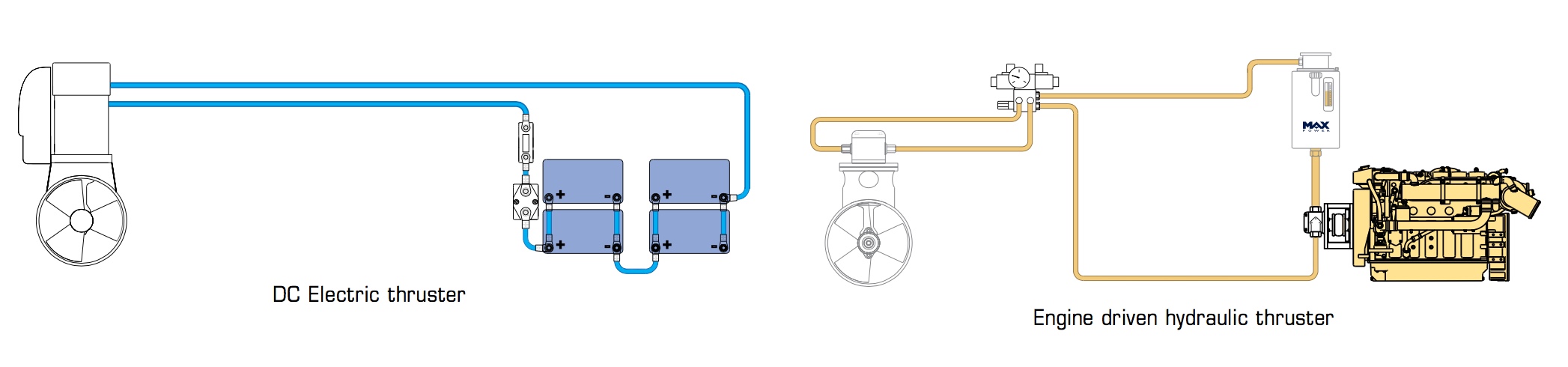 Bug- und Heckstrahlruder, ob ausfahrbar oder Tunnel, benötigen eine Energiequelle. Auf einer Yacht kann dieses entweder ein 12 / 24V DC Elektromotor, oder eine Hydraulikpumpe sein.