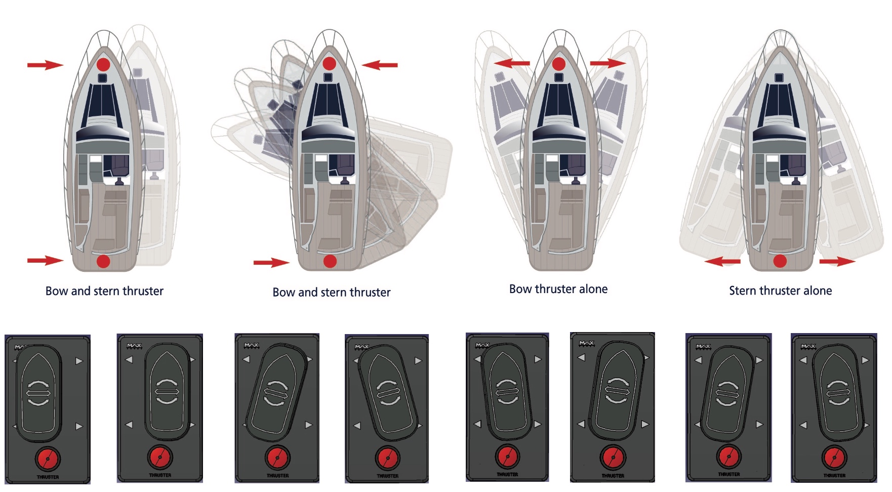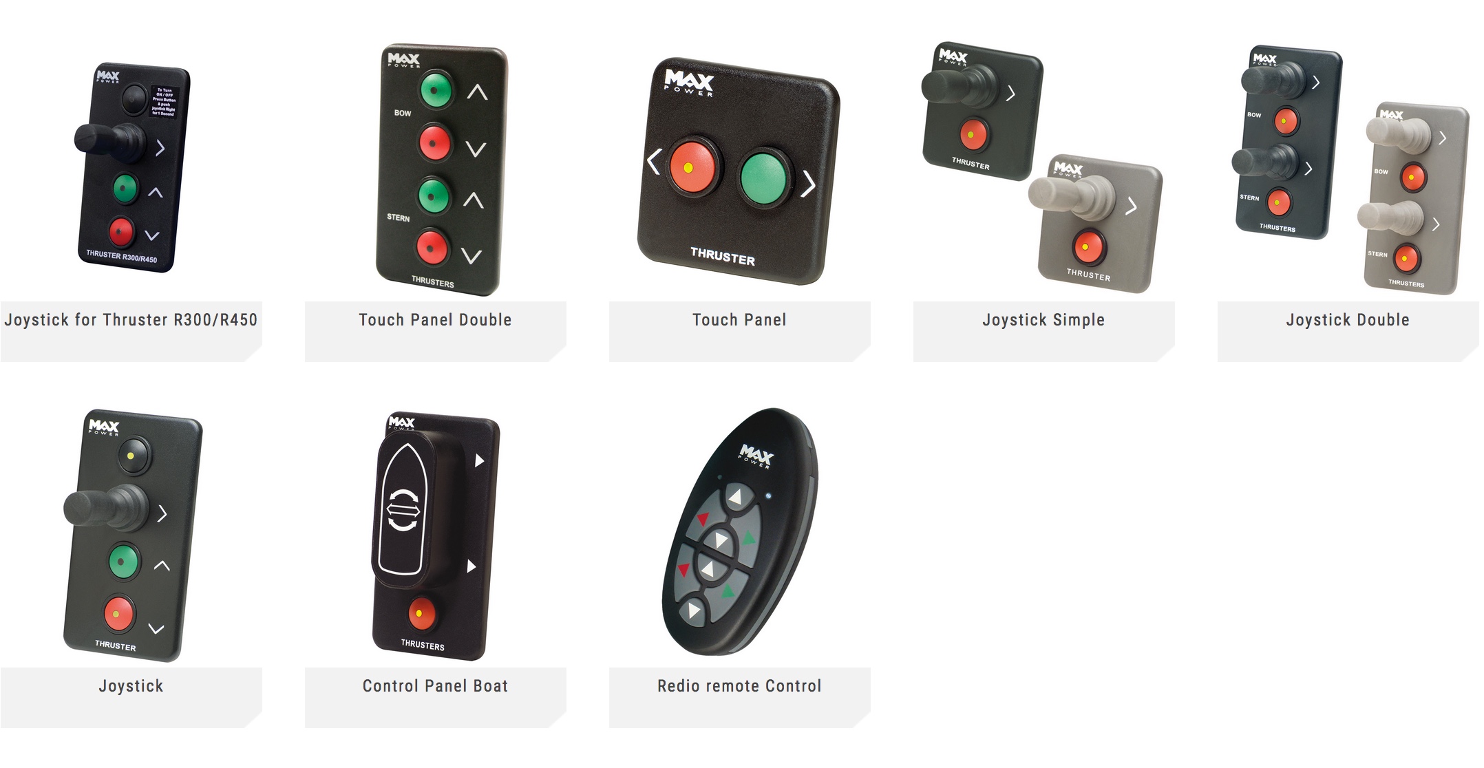 Alle Bedieneinheiten wurden speziell für die Tunnel -und ausklappbaren Querstrahlruder von Max Power entwickelt. Die Bedieneinheiten können leicht in einer Aussparung montiert werden und werdenmit einer einfachen und leicht austauschbaren, wasserfesten Abdeckung geliefert. Jede Einheit verfügt über beidseitige Steckkontakte mit einem wieder verwendbaren Stecksystem.
