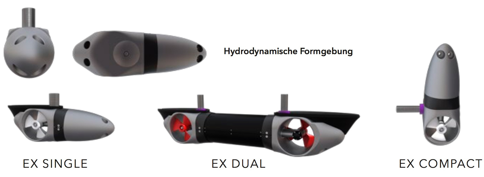 Die EX Modelle können in allen Bootstypen verwendet werden, egal ob es sich um Segelboot, Motorboot, Katamaran oder Hausboot mit Stahl-, Aluminium-, Holz- oder GfK-Rumpf handelt. Da die externe Bugschraube im Vergleich zu einer konventionellen Tunnelbugschraube weiter vorne, Richtung Bug eingebaut wird und über eine deutlich tiefere Einbauposition verfügt, wird eine wesentlich bessere Hebelwirkung erreicht. Deshalb können die EX Bugschrauben bei nominell geringerer Leistung erheblich größere Boote bewegen.