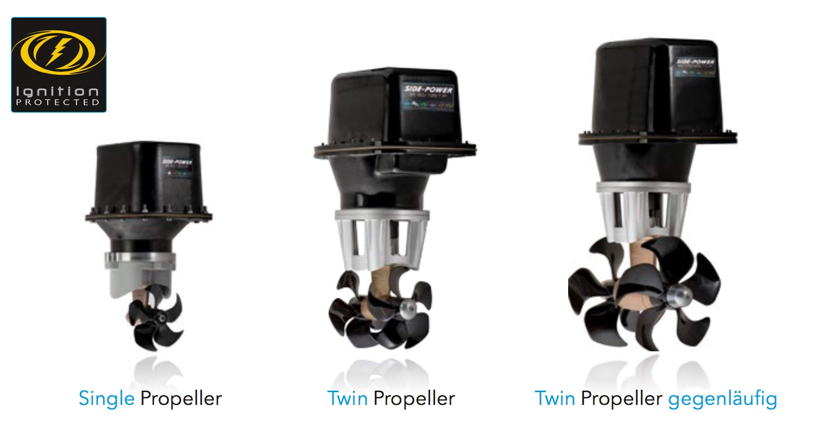 Damit elektrische Side-Power Bug- und Heckschrauben auch auf Booten mit Benzinmotoren sicher im Motorraum eingebaut werden können, denn sie bieten eine Baureihe mit Modellen in gekapselter Ausführung an. In dieser Variante entsprechen die Systeme den Anforderungen zum ‘Funkenschutz’ nach ISO 8846. Die Kapselung aus Verbundwerkstoff gewährleistet, dass weder Benzindämpfe noch Feuchtigkeit und Wasser an den Elektromotor oder andere Systemkomponenten gelangen können. Dadurch eignen sich diese Ausführungen auch für eine Installation im Heckbereich, wo ein leichter Wassereintritt nicht immer ausgeschlossen werden kann.