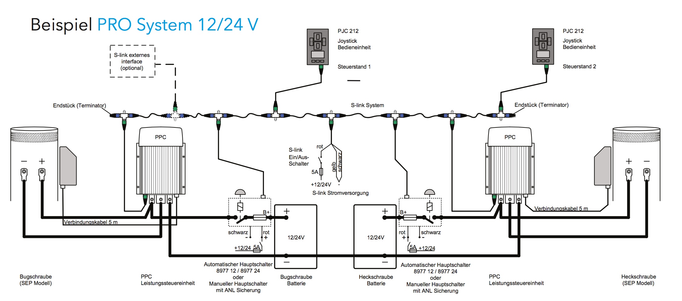 Ein PRO System mit Drehzahlregelung besteht prinzipiell aus proportionalen Bedieneinheiten, Leistungselektronik und einer Bugschraube mit Gleichstrommotor. Die Komponenten werden über das neue S-link Steuerungssystem miteinander verbunden. Die verwendeten Bugschrauben entsprechen mechanisch und elektrisch den bewähr- ten Modellen der SE Baureihe. Sie verfügen lediglich über einen zusätzlichen Temperatursensor und eine andere Steuerelektronik.