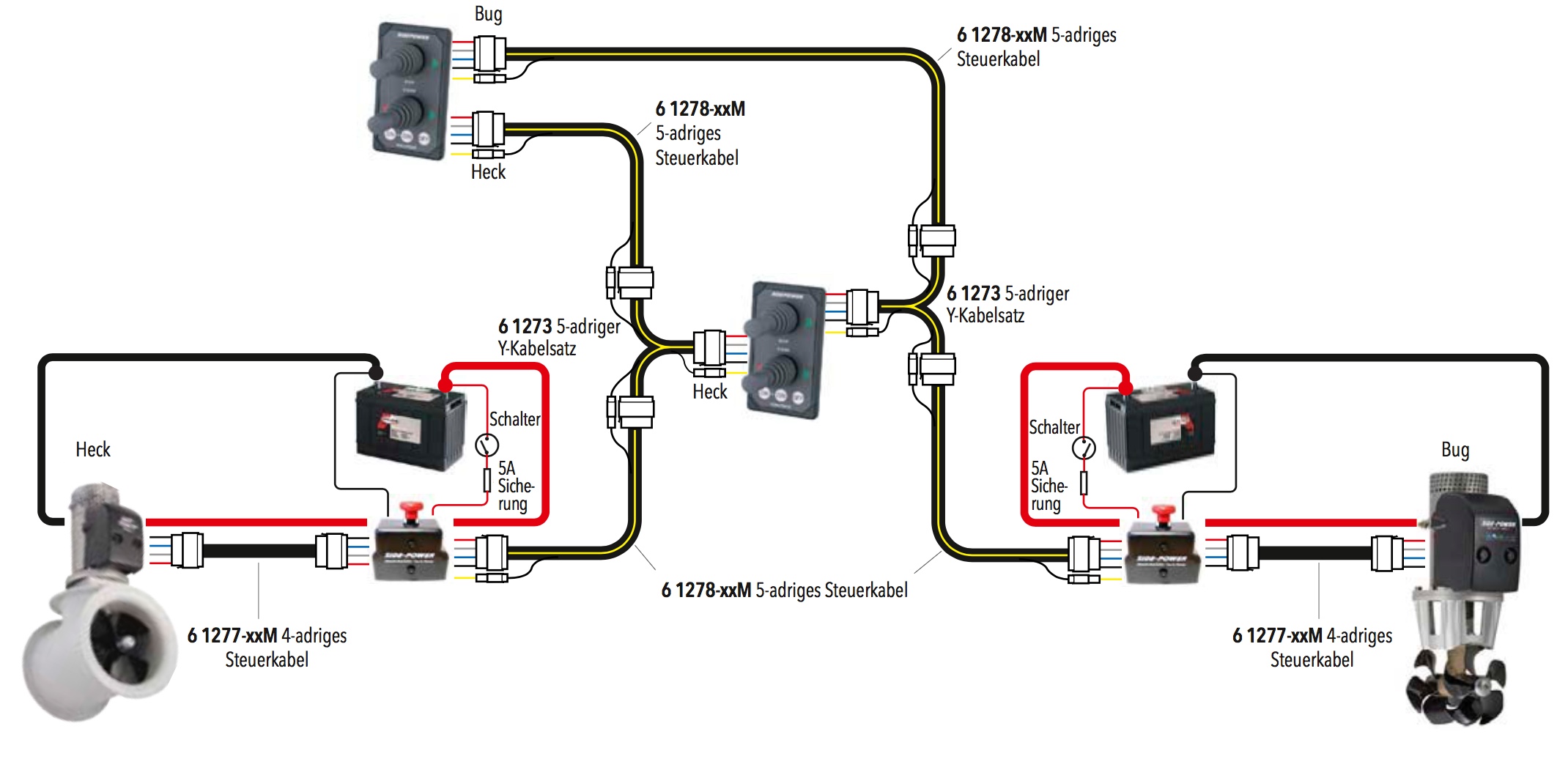 Ein komplettes System für Ihr Boot besteht aus mehreren Komponenten. Neben Bug- und Heckschrauben mit jeweils passendem Tunnel bzw. Hecktunneleinheit benötigen Sie Steuerkabel, Hauptschalter (automatisch bzw. manuell), Sicherungen, Sicherungshalter, Bedieneinheit(en) und Batteriekabel. Als optionales Zubehör bietet sich eine Funkfernbedienung an.