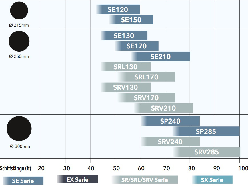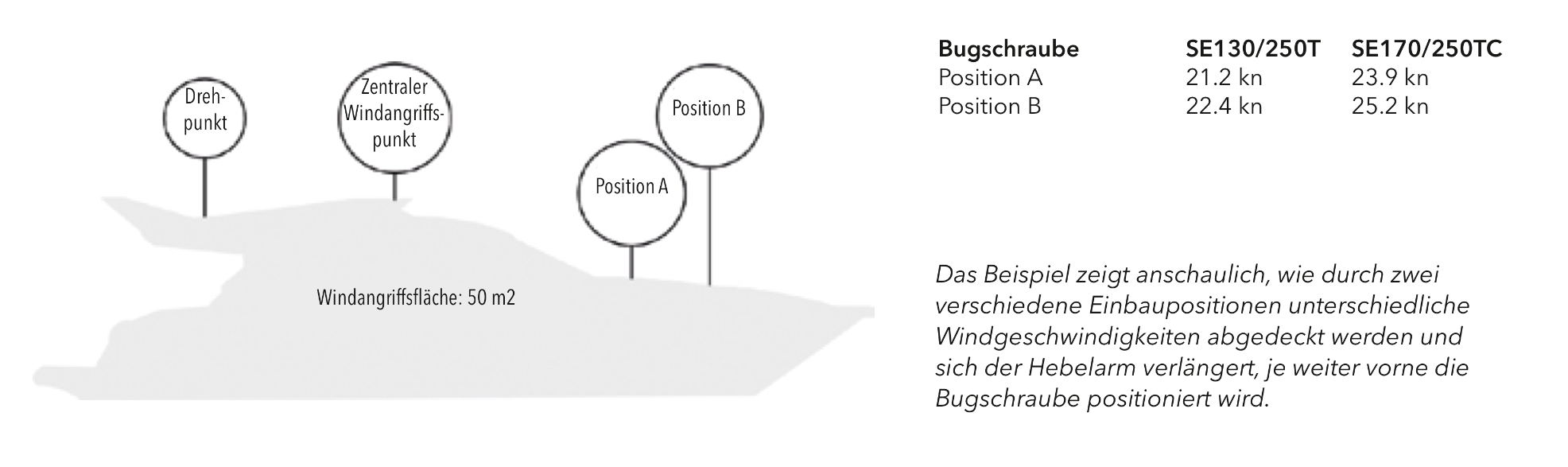 Bei einem Boot mit 13,5 m (45 Fuß) Länge kann bei normaler Dimensionierung der Bugschraube zwischen vier verschiedenen Größen gewählt werden. Bei geringer Windangriffsfläche und vorwiegender Nutzung bei guten Wetterbedingungen kann die kleinste Bugschraube (SE80, 185 mm Tunnel) gewählt werden. Wenn ein 185 mm Tunnel optimal eingebaut werden kann, aber mehr Schubleistung benötigt wird, ist die SE100 eine gute Wahl. Besteht die Möglichkeit, einen größeren Tunnel einzubauen, sind bei dieser Bootsgröße die Modelle mit 215 und 250 mm Tunneldurchmesser entsprechende Optionen. Prinzipiell ist bei größerem Tunneldurchmesser ein höherer Wirkungsgrad und ein geringeres Geräuschniveau möglich.