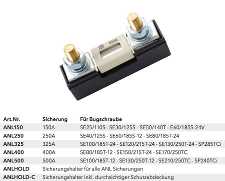 Die Sicherungshalter von Side-Power sind deren Eigenfabrikate. Sie wurden speziell für ANL Sicherungen entwickelt, um den Spannungsabfall und die Erwärmung weitestgehend zu reduzieren.