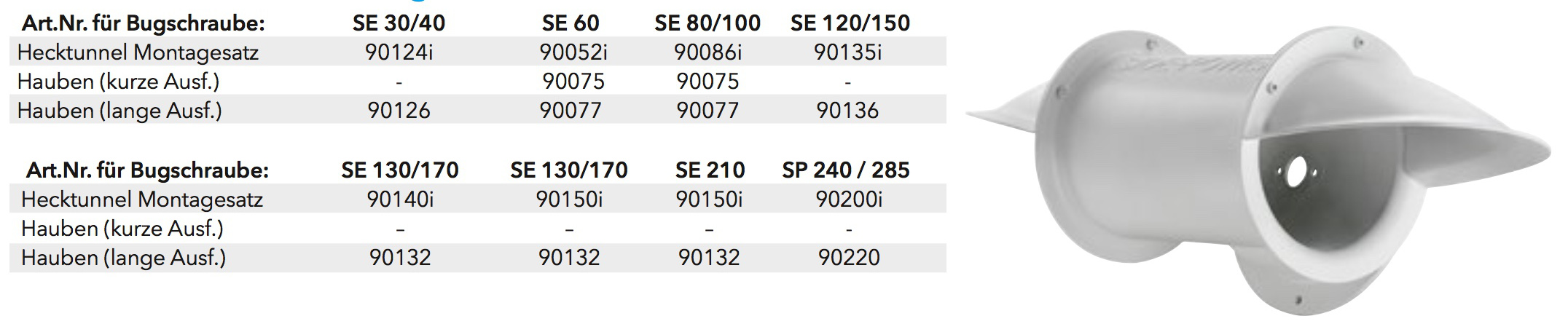 Die gesamte Einheit wird am Heckspiegel montiert. Ziel bei der Konstruktion war es, einen bestmöglichen Wirkungsgrad zu erreichen. Für größtmögliche Festigkeit und Stabilität wird der Tunnel aus GfK gefertigt. Der Einbau ist einfach und die Einheit bietet den gleichen Qualitätsstandard wie unsere Bugschrauben. Optional erhältliche Hauben ermöglichen die Montage einer Heckschraube in Booten mit geringem Tiefgang oder falls ein effizienter Wasserstom der Heckschraube durch Unterwasserteile von Z-Antrieben beeinträchtigt wird.