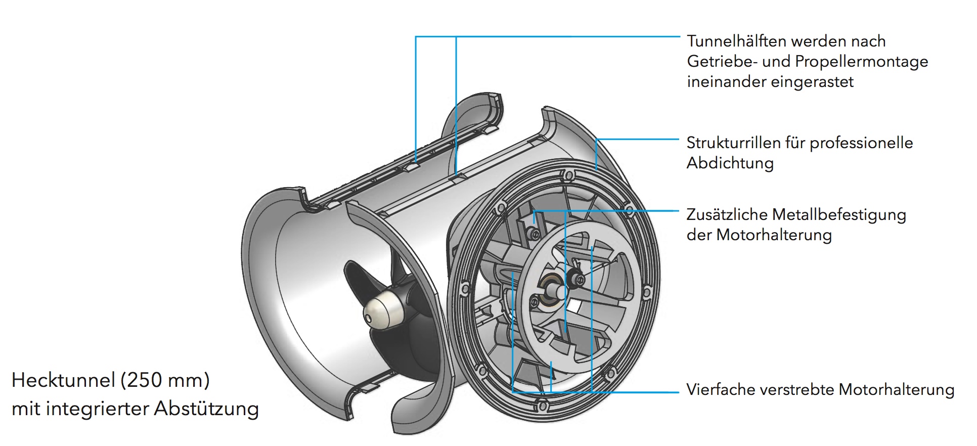 Bei der neuen 250 mm Ausführung ist der Tunnel zur vereinfachten Montage zweigeteilt. Durch die integrierte, verstärkte Abstützung von Motorhalterung und Elektromotor wird kein zusätzlicher Stützträger im Bootsinneren benötigt. Die geteilte Ausführung ermöglicht eine einfache und zeitsparende Installation der vormontierten Einheit durch den Montageausschnitt im Heckspiegel. Damit entfällt das montagebedingte Anheben des Elektromotors unter beengten Platzverhältnissen im Maschinenraum.