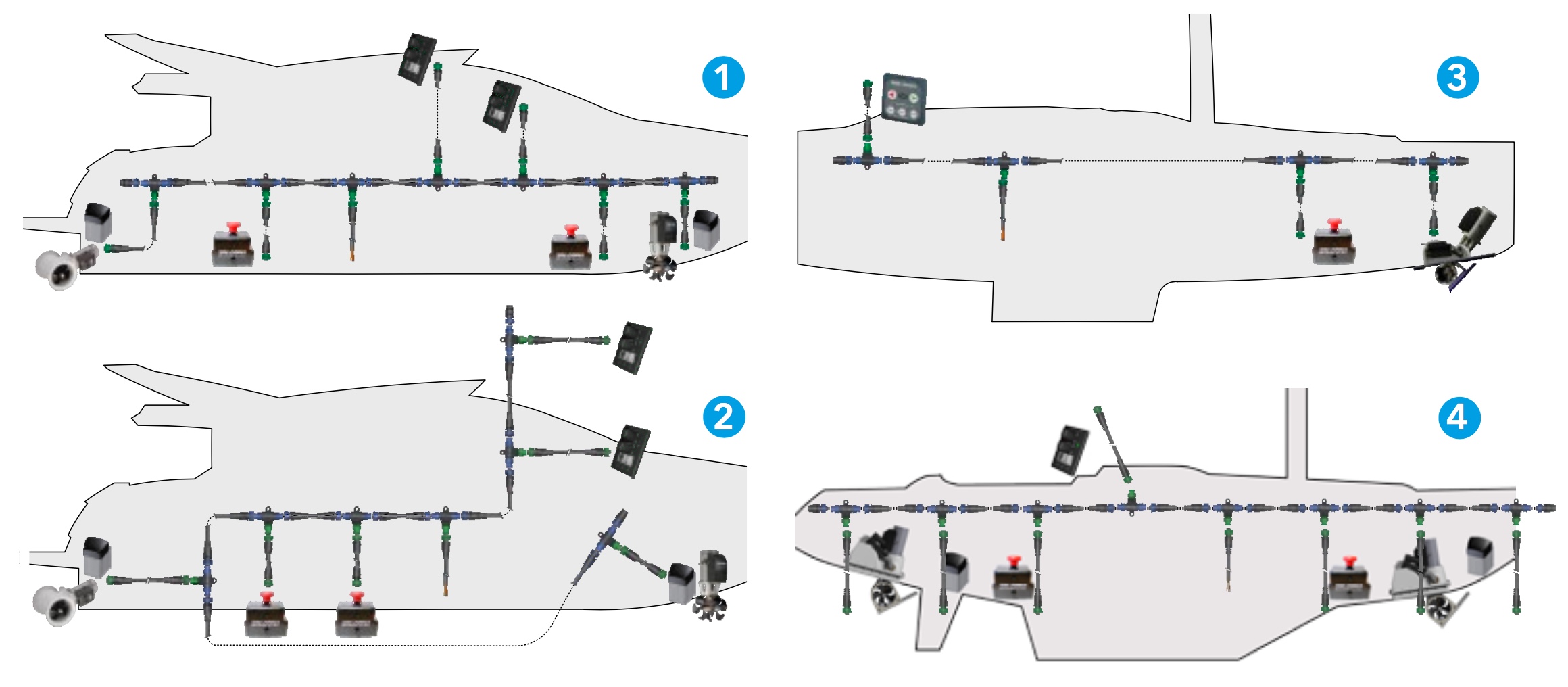 Beispiel 1 & 2: S-link System für Boote mit zwei Steuerständen und drehzahlgeregelter Bug- und Heckschraube. Da die verschiedenen Geräte im S-link Sytem in beliebiger Reihenfolge angeschlossen werden können, kann der zweckmäßigste Verlauf der Hauptleitung, hinsichtlich der Platzverhältnisse an Bord, gewählt werden.