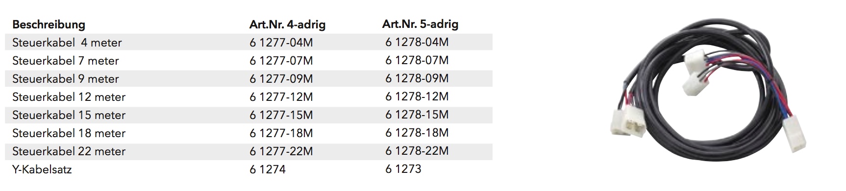 Die original Side-Power Steuerkabel mit Plug & Go System bieten eine hochwertige elektrische Verkabelung des gesamten Systems. Sie sind in vielen verschiedenen Längen lieferbar. Zusätzliche Bedieneinheiten können mit dem Y-Kabelsatz angeschlossen werden. Die Kabel sind farblich kodiert und mit Qualitätssteckern versehen. Korrekte elektrische Anschlüsse garantieren richtige Funktion von Anfang an. Die Plug & Go Steuerkabel werden für alle Systeme benötigt (ausgenommen ausfahrbare Bugschrauben und PRO Modelle).