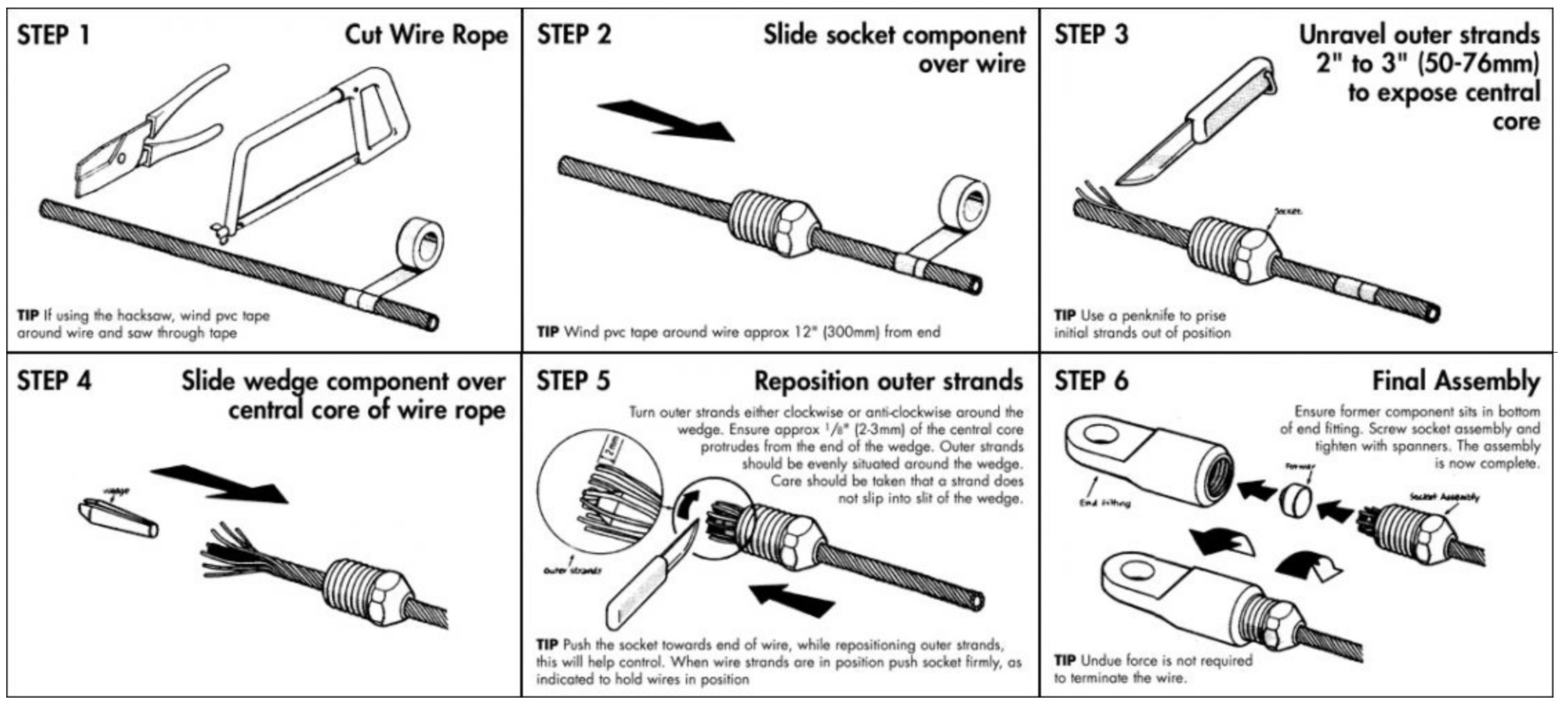Sta-Lok Schraubterminals werden mit Handwerkzeug verarbeitet - im Gegensatz zu Walzterminals, die mit Walzmaschinen oder Rotationshämmern verarbeitet werden. Insoweit liefert das STA-LOK-System ein einfaches mechanisches Verfahren zum Verarbeiten von Drahtseilen, das die verarbeitung vor Ort auf der Baustelle ermöglicht.